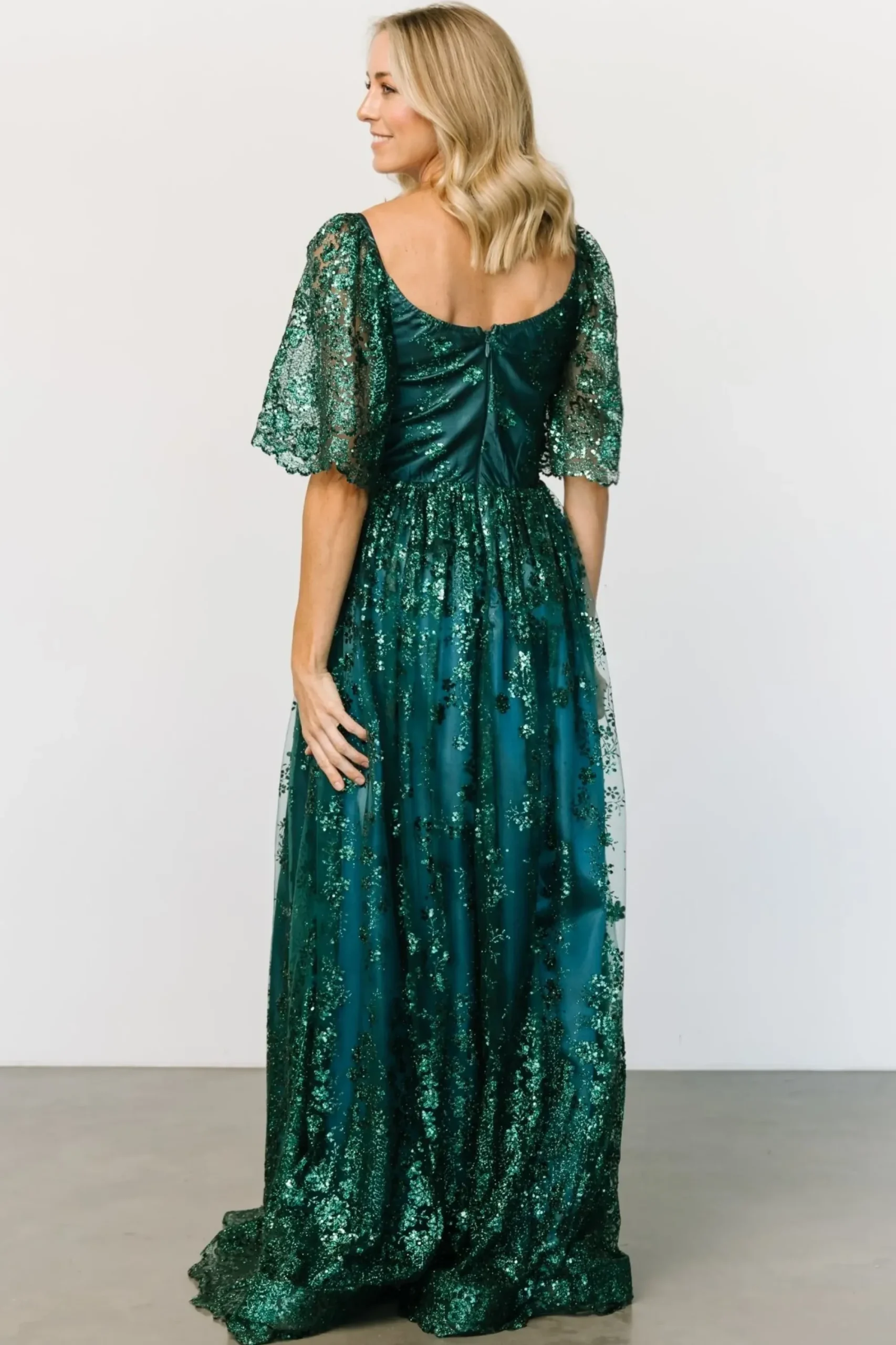 - Sparkling emerald sequins throughout