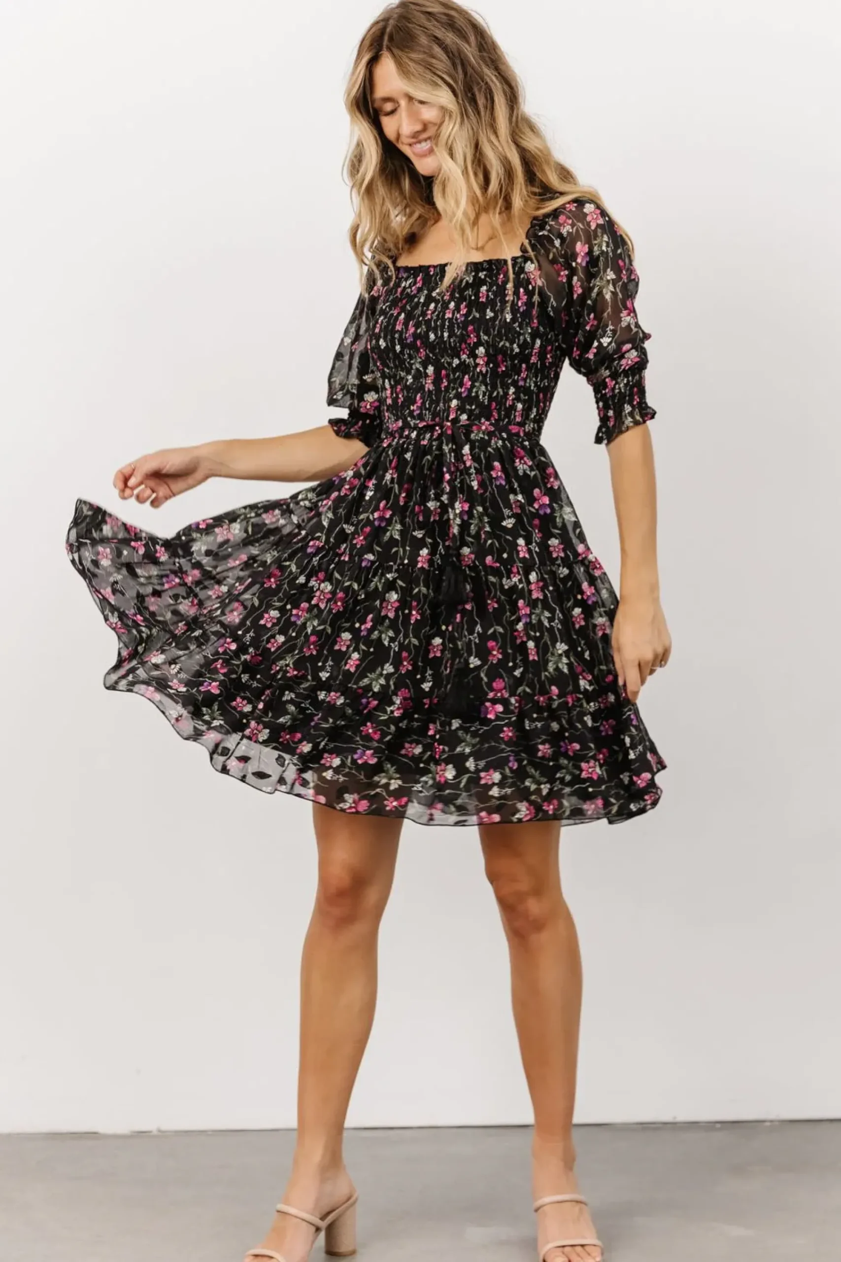 Online Baltic Born Azlyn Smocked Short Dress | Black + Purple Floral