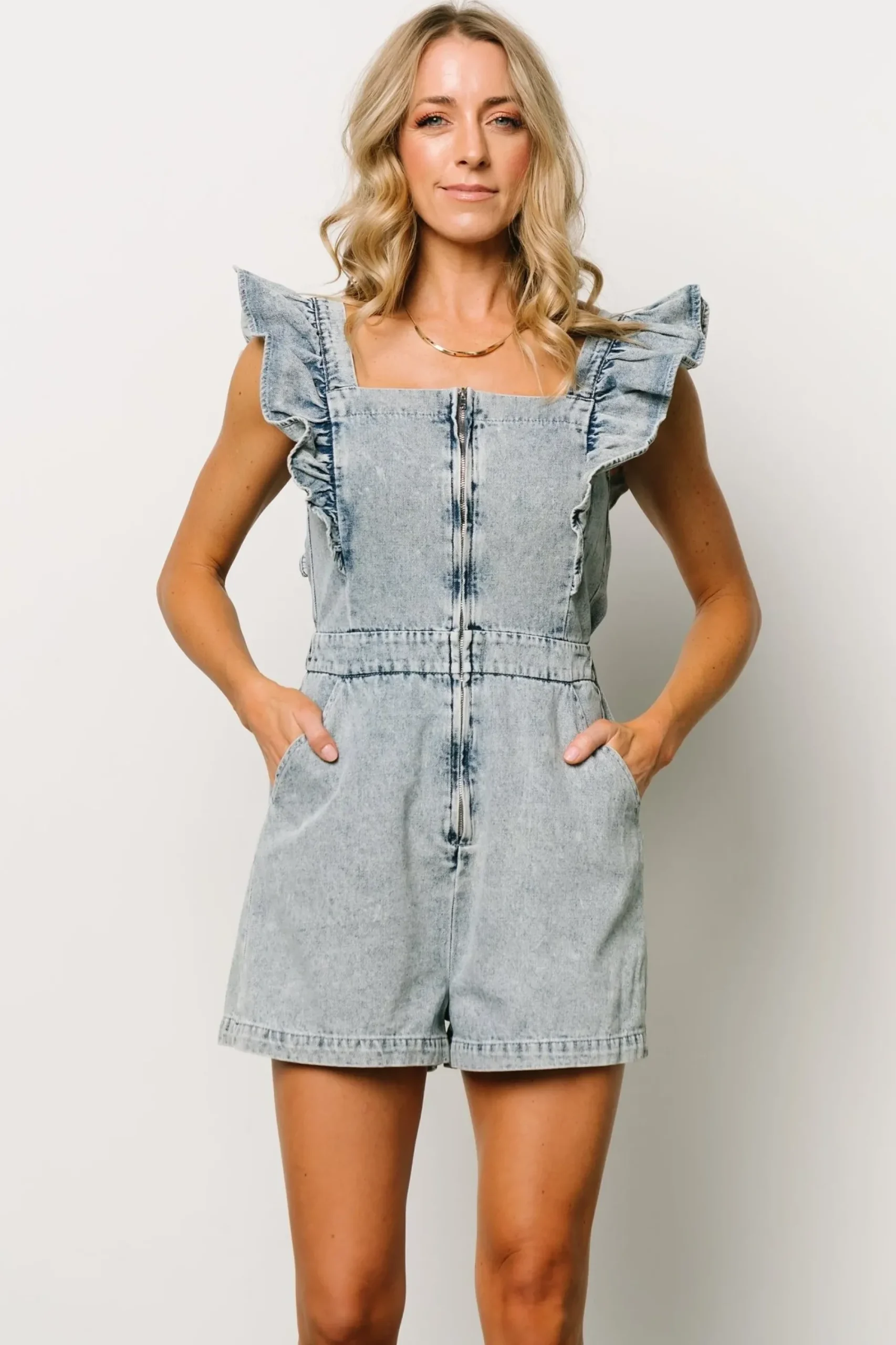 - Summer fashion is calling with this darling denim romper!