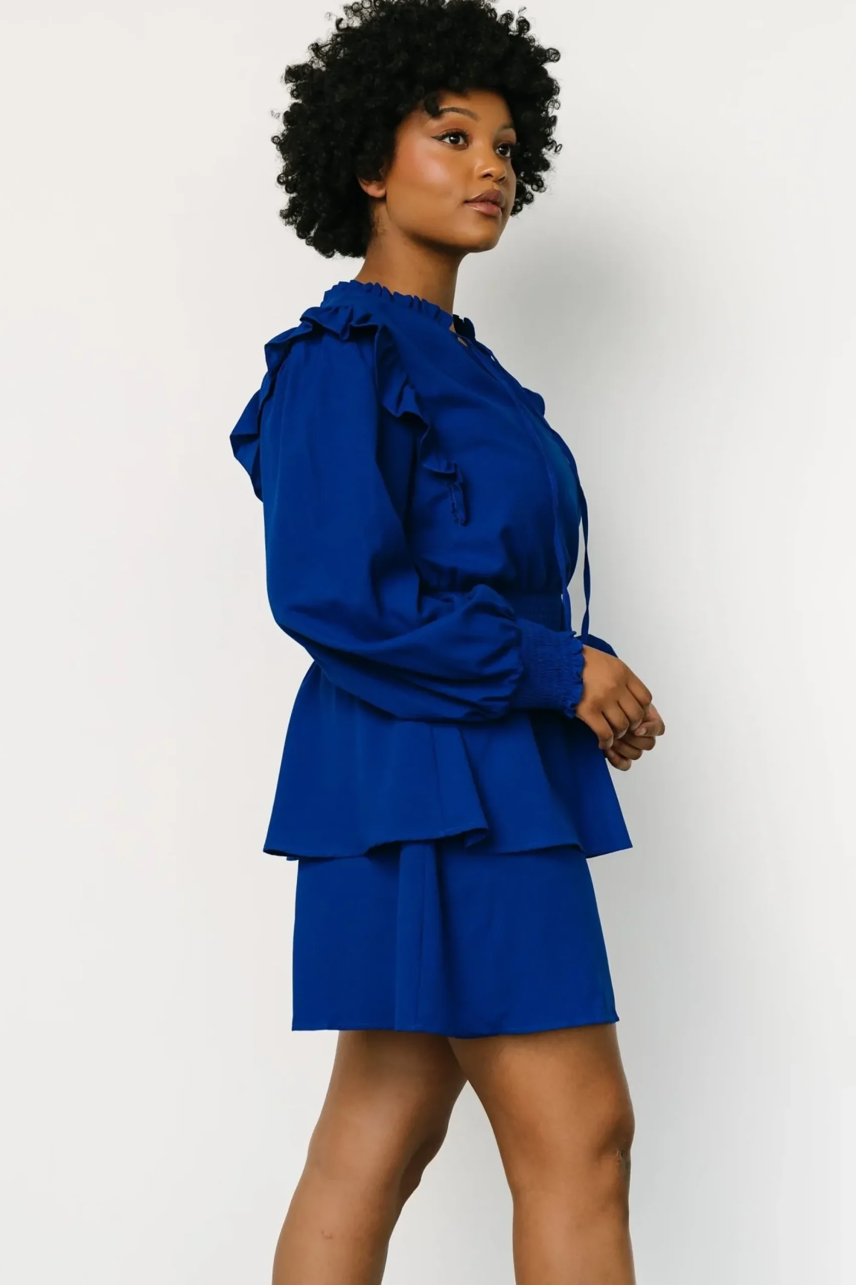 - High neckline with ruffle detail at collar