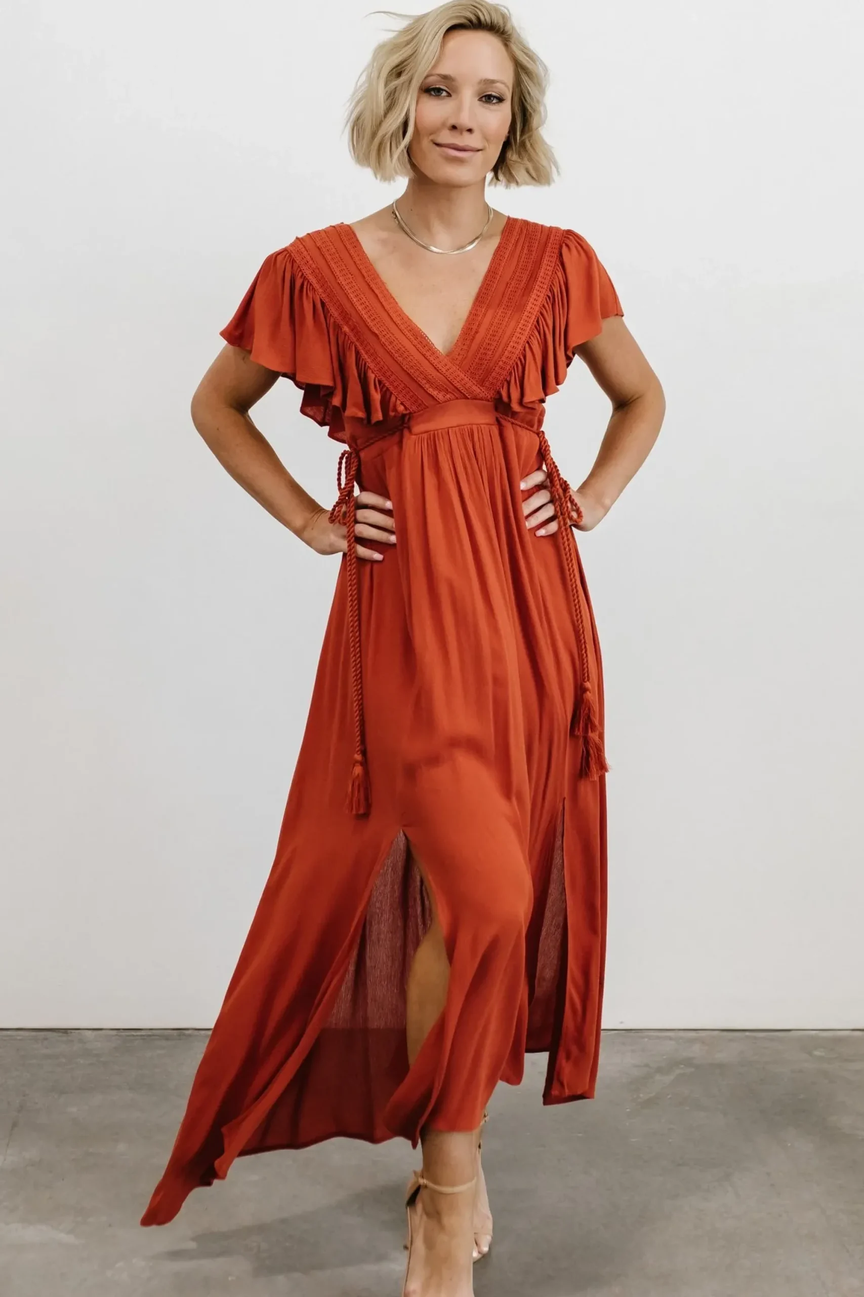 - Unique tassel rope ties at side
