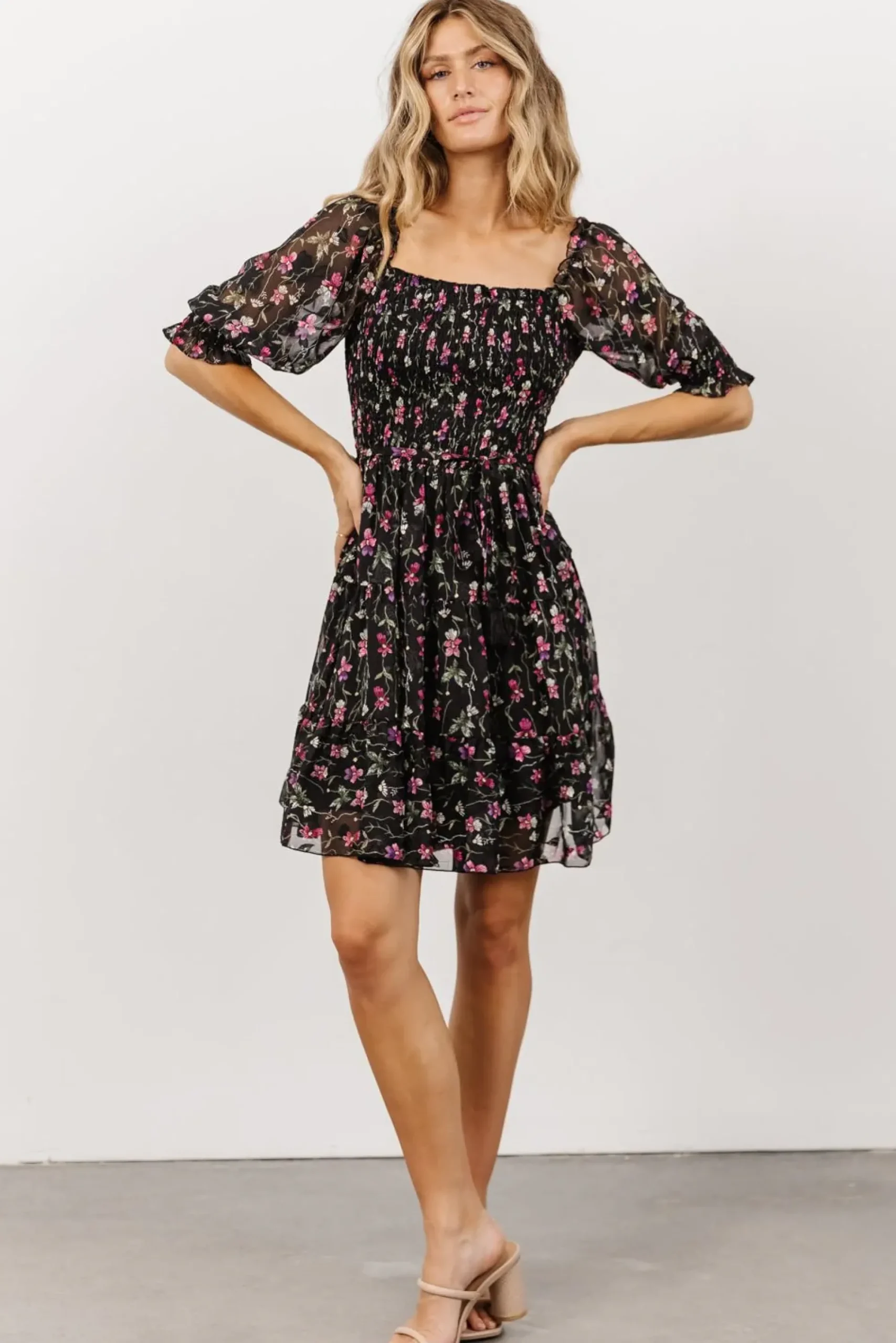 Online Baltic Born Azlyn Smocked Short Dress | Black + Purple Floral